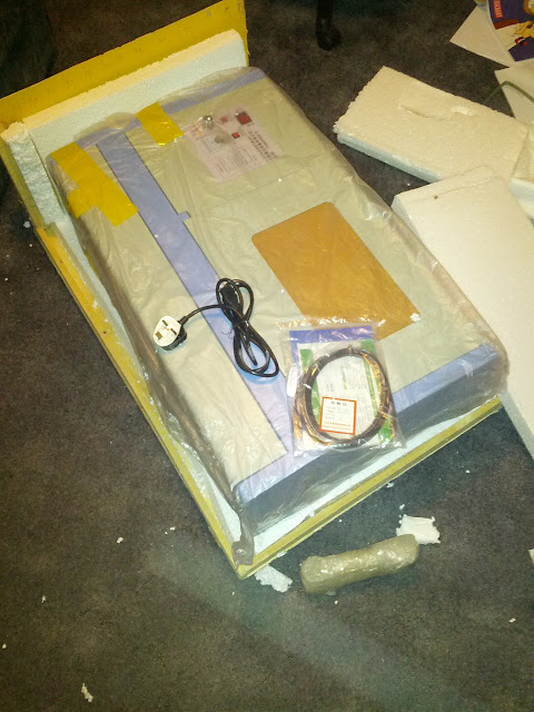 So, the packaging wasn’t too bad. It was obviously shipped from China, and just redistributed from Portsmouth with no actual unpacking. The outer wooded crate was quite battered and falling apart, with lots of packing tape. Thankfully, inside the crate was lots of polystyrene, and the actual device was in good shape. The x/y carriage was secured with a bit of ribbon, and all electronics were well secured. Now, from various other blogs, I know this was very lucky for me as many other people complain of loose connections and missing screws. About the only complaint I have on the whole packaging front is the way the water cooling tubes were tied in knots. This put some rather bad kinks into the tubing which could restrict the water flow.